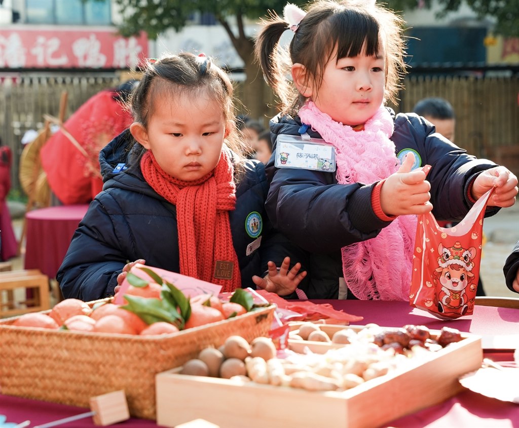 在“讨个好彩头”制作体验区里,孩子们了解生活中有寓意的食物,设计好彩头幸运签,将寓意美好生活的食物亲手包起,共同创造与传递美好生活;
