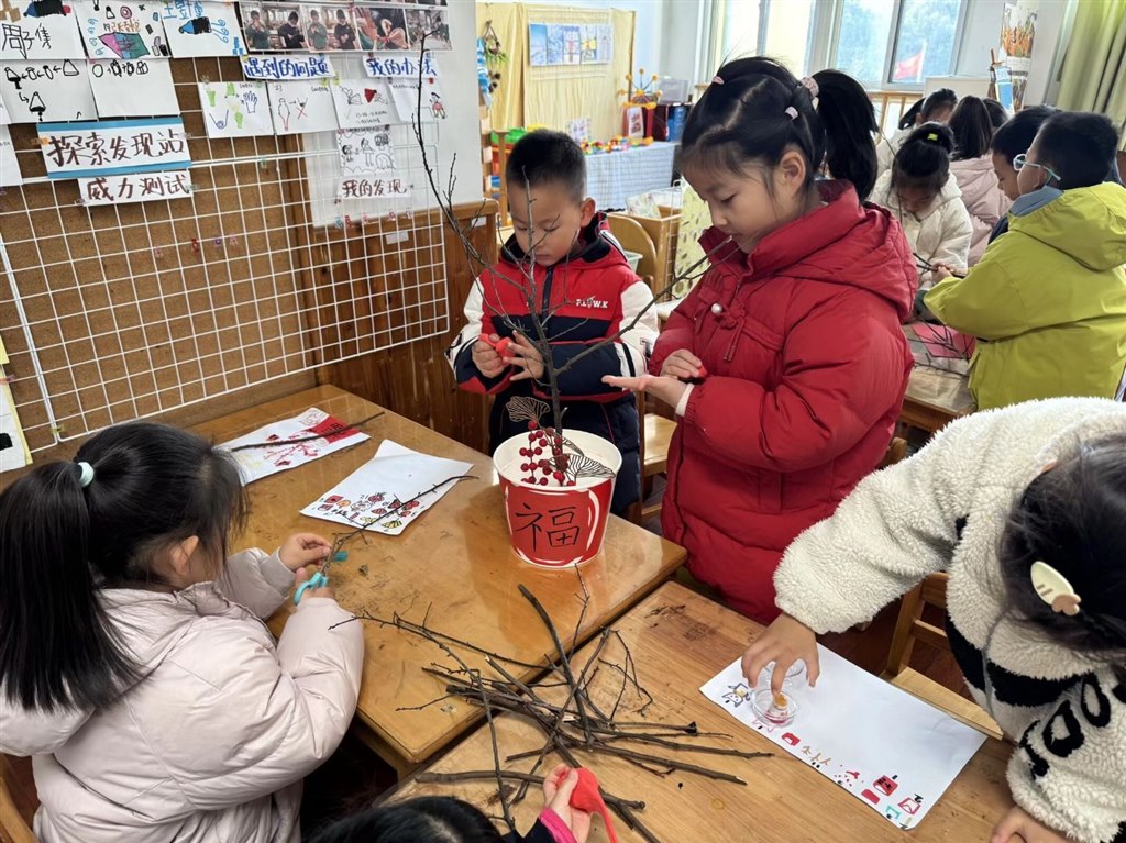 在“巧手纳福”“年华雅集”体验区里,孩子们写福字、剪窗花、贴春联、制作年宵花,在对称、色彩与造型中感受传统美学,促进手部精细动作与传统雅趣;