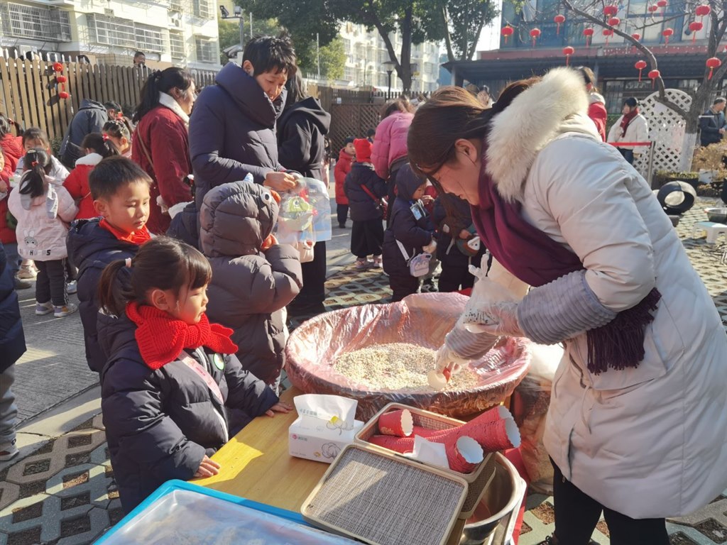 在“幸福粥全”活动中,孩子们依据腊八节习俗,收集百家豆,在真实的交往中发展社会性与归属感;