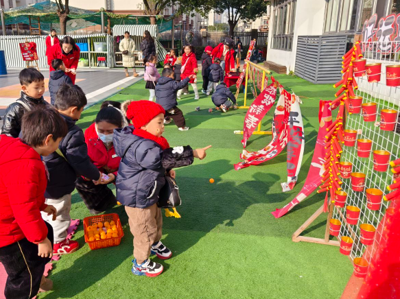 在“欢聚一堂”绘本剧、吉祥话表演区,孩子们以新年绘本为载体,角色分工、设计台词……共同用语言表达与戏剧创编演绎新春的祝福,文化的传承与情感的表达;在“邻里游乐汇”民间游戏区里,孩子们投壶瞄准、套圈寓意、趣味飞镖、蒙眼击锣……在嬉闹中触摸传统,在民俗中浸润传承,把中国民间文化悄悄种进心里;